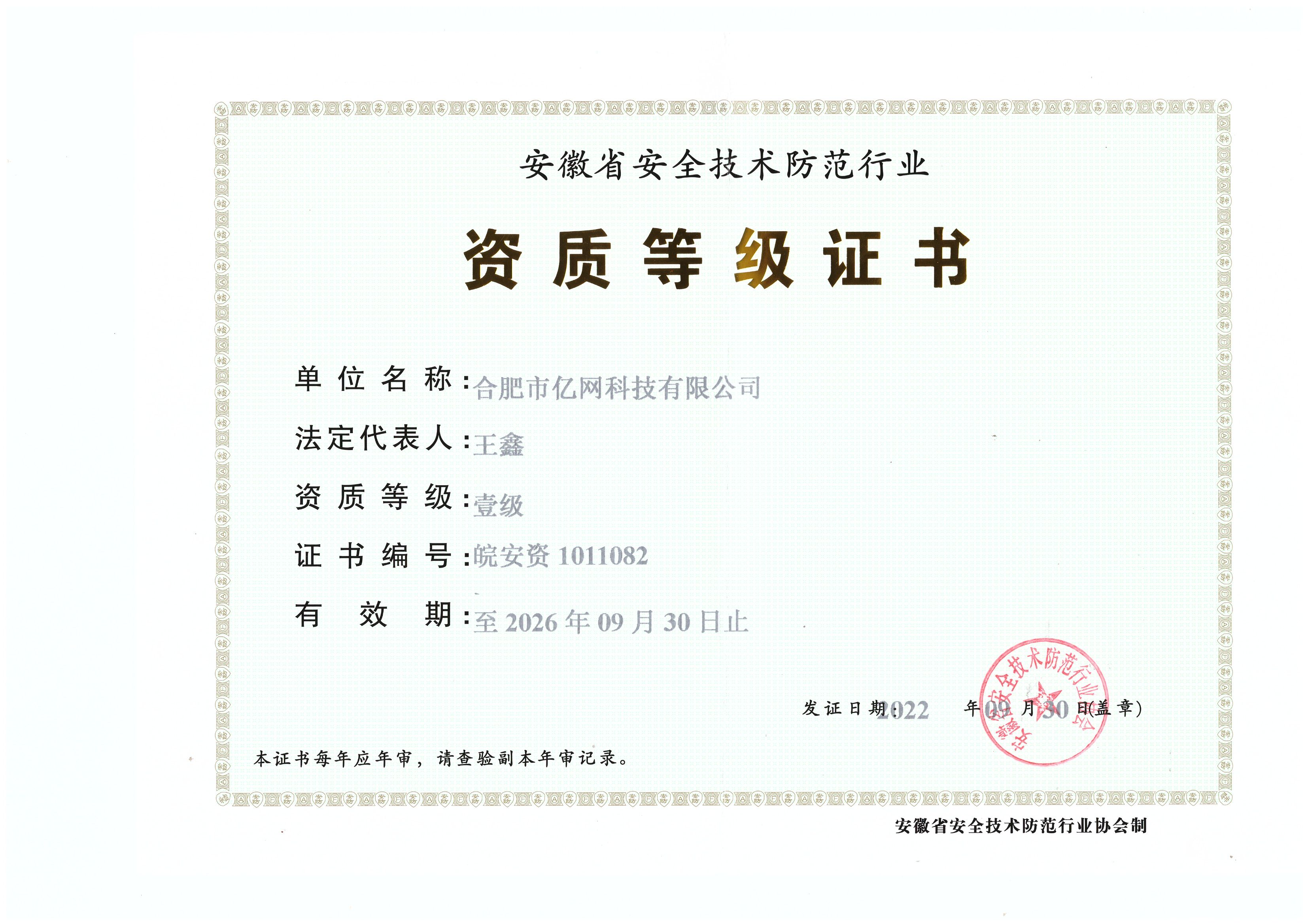 合肥市億網(wǎng)科技有限公司《安徽省安全技術(shù)防范行業(yè)資質(zhì)等級(jí)證書