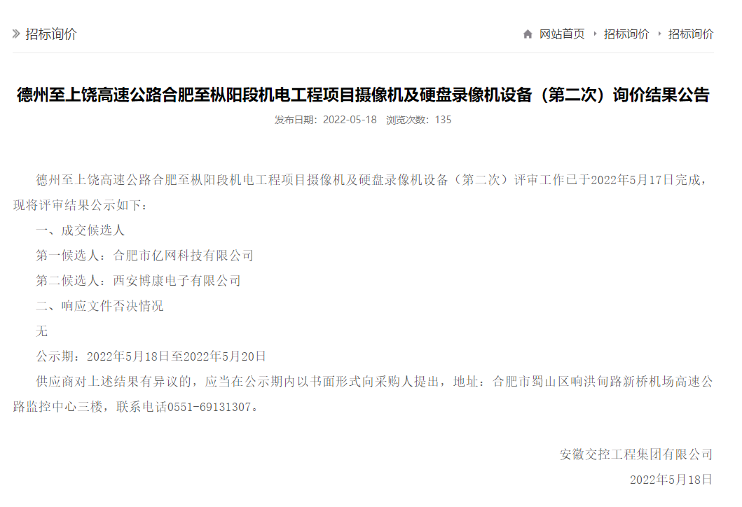 5月18日,再傳捷報,合肥市億網(wǎng)科技有限公司在眾多的競爭者中經(jīng)過公司各部門相關(guān)人員團(tuán)結(jié)一致、齊心努力,憑借過硬的技術(shù)實力、良好的信譽和豐富的項目經(jīng)驗贏得了業(yè)主和評標(biāo)委員會的肯定,我公司在競標(biāo)中兩次擊敗競爭對手,最終中得安徽交控工程集團(tuán)有限公司《德州至上饒高速公路合肥至樅陽段機(jī)電工程項目》。